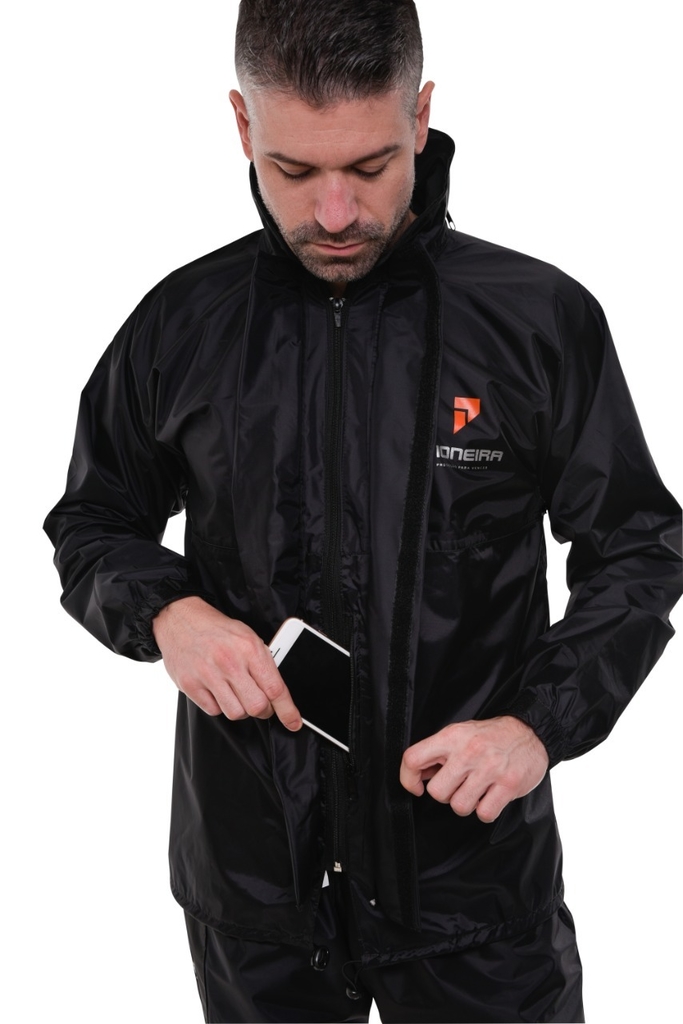 CALCA E JAQUETA COM FECHAMENTO EM ZÍPER E VELCRO RECOBERTOS POR UMA LAPELA DE DRENAGEM